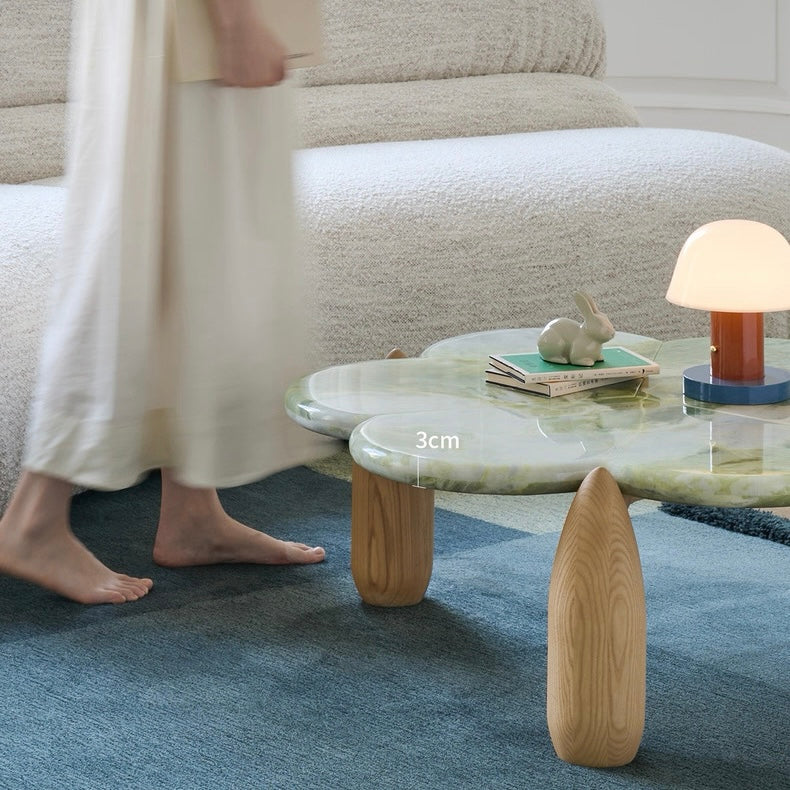The Cleopatra Coffee Table is a tribute to spring — a sculptural piece designed to bring softness, light, and natural energy into your home. Carved in a blooming petal silhouette, the tabletop is crafted from premium Green Onyx, a stone known for its flowing clouds of white, mossy green gradients, and naturally occurring crystal veins. Each table surface is completely unique, shaped by time and nature, making every piece one-of-a-kind.